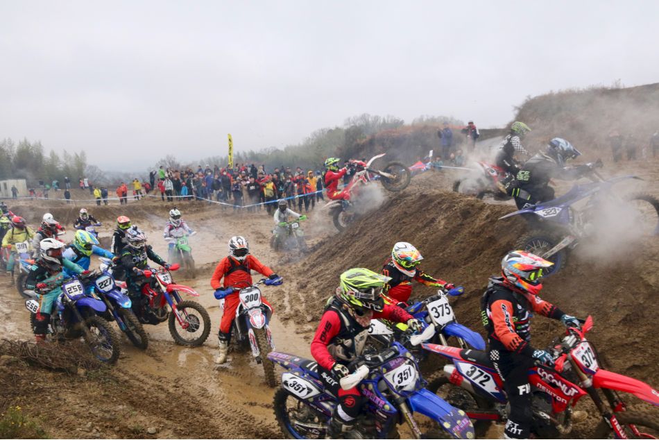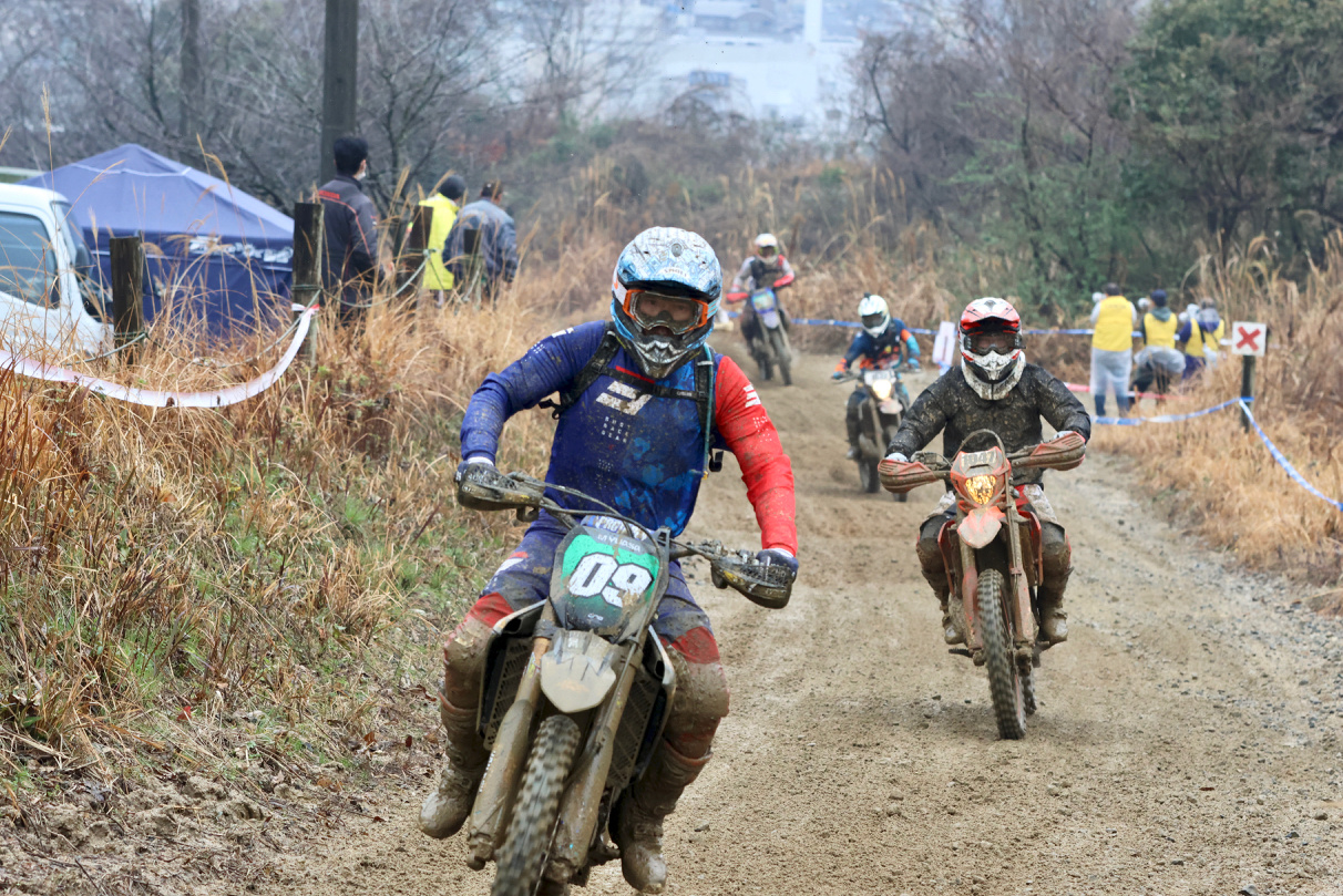 - さて、前日の好天気とは打って変わり、日曜日は朝から気温が低く、雨がぱらつく天気模様。スタート位置が今年から変更され、モトクロスコース内のワイドなストレートからの一斉スタートとなった。コースディレクターの萩原一氏によれば「昨年までは10台くらいしか横に並べず、1コーナー以降のセクションも狭かったので、出遅れてしまうと致命的になってしまいましたが、今回からは20台以上が並べるようになりました。スタートで出遅れても勝負できる『ストレスフリー』にしています」と語ってくれた。