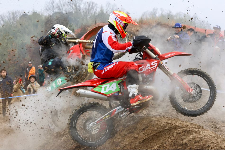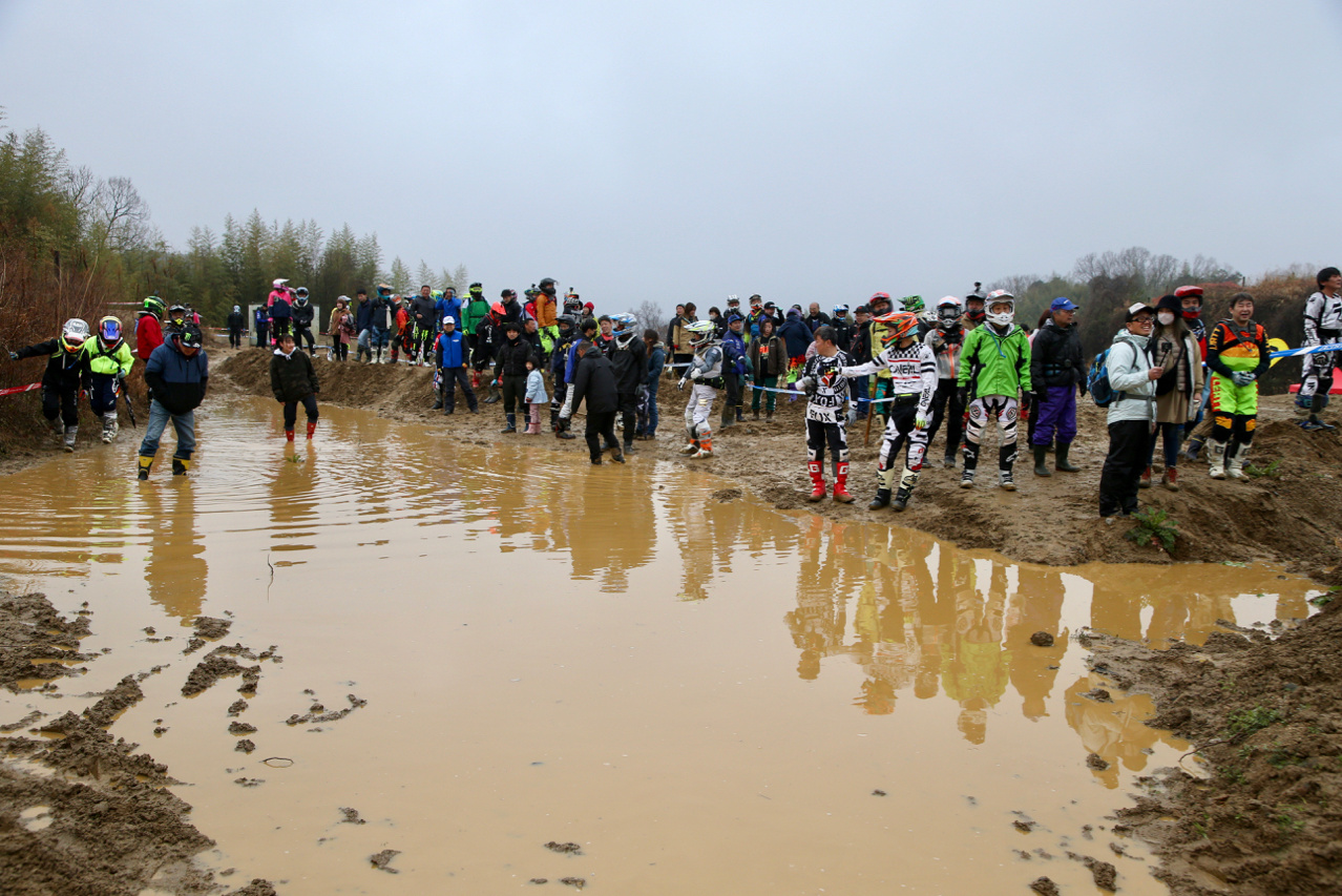 - 午前9:00、いよいよ2024年最初のFUN GPが始まる。コース全長は5.5km。COMP GPよりも約1km短いレイアウトが用意された。FUN GPはCOMP GPに比べると比較的難易度の高いセクションが少ないものの、この日最初のレースゆえに路面状況は走ってみないと分からない。しかも、深く溜まった水たまりの水溜りが待ち受けているではないか! ライダーブリーフィング前にライダー達は戦々恐々としながら、2コーナー先に待ち構える大きな水たまりをチェックする姿があった。