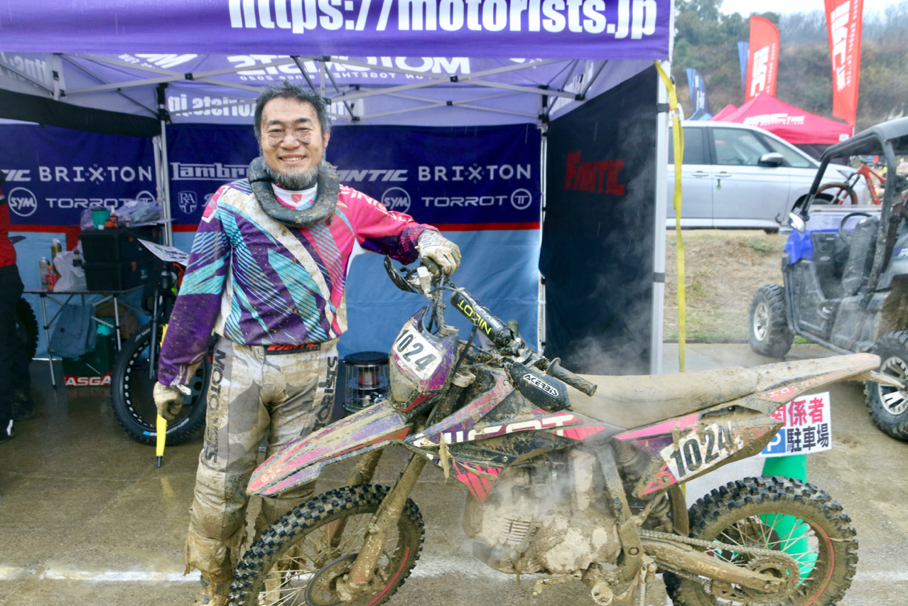 - 自社が取り扱うモーターサイクルでレース参戦中の 野口英康 選手(FANTIC MOTORISTS RACING)。今回は30万円代で買えるNICOT「XE125」で参戦。190ccにボアアップ済みでフレームも強化されているようだ。レース初心者にもオススメとのこと。