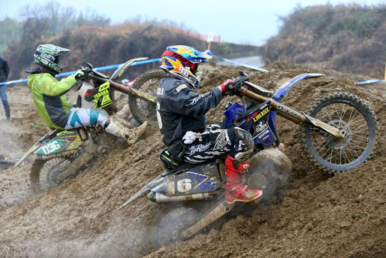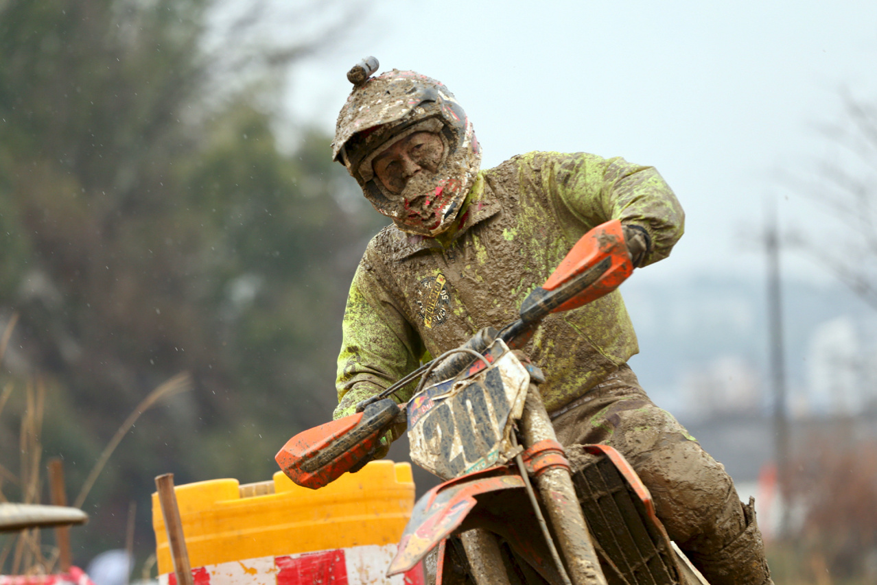 - しかしそこはあらゆる路面に対応することに慣れているオフロードライダー。水たまりは見た目ほど深くなく、また阪下の土質状、雨が降り続いている限りスタックする恐れがない。スタートでは濡れるのを避けるため水たまりの脇のラインを選択するライダーが多かったものの、ど真ん中を思い切り突っ切る猛者もいる。問題はその後のバンク坂だ。普段はモトクロスコースのバンクとなっている部分を通過しなければいけないのだが、ここで失速してスタックしてしまうライダーがでた。その一人がまさかの#05岩井良宏選手(331 Racing Team)だった。岩井選手といえば昨年の開幕戦を制するなど、阪下にめっぽう強いイメージなのだが、ここにまさかの落とし穴があった。スタートで出遅れた岩井選手はその後も淡々と走り切り、FUN-Aクラス10位でフィニッシュしている。
