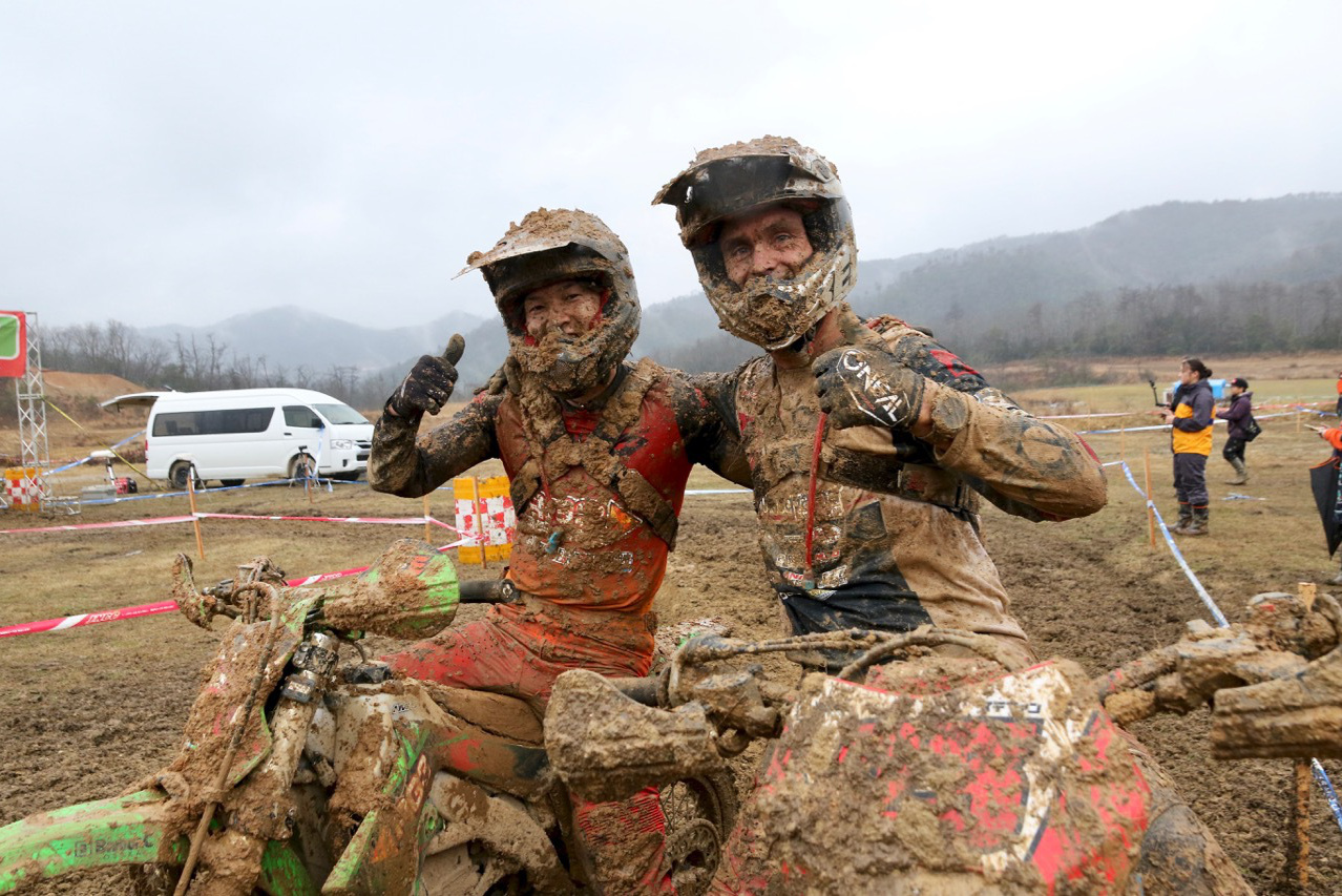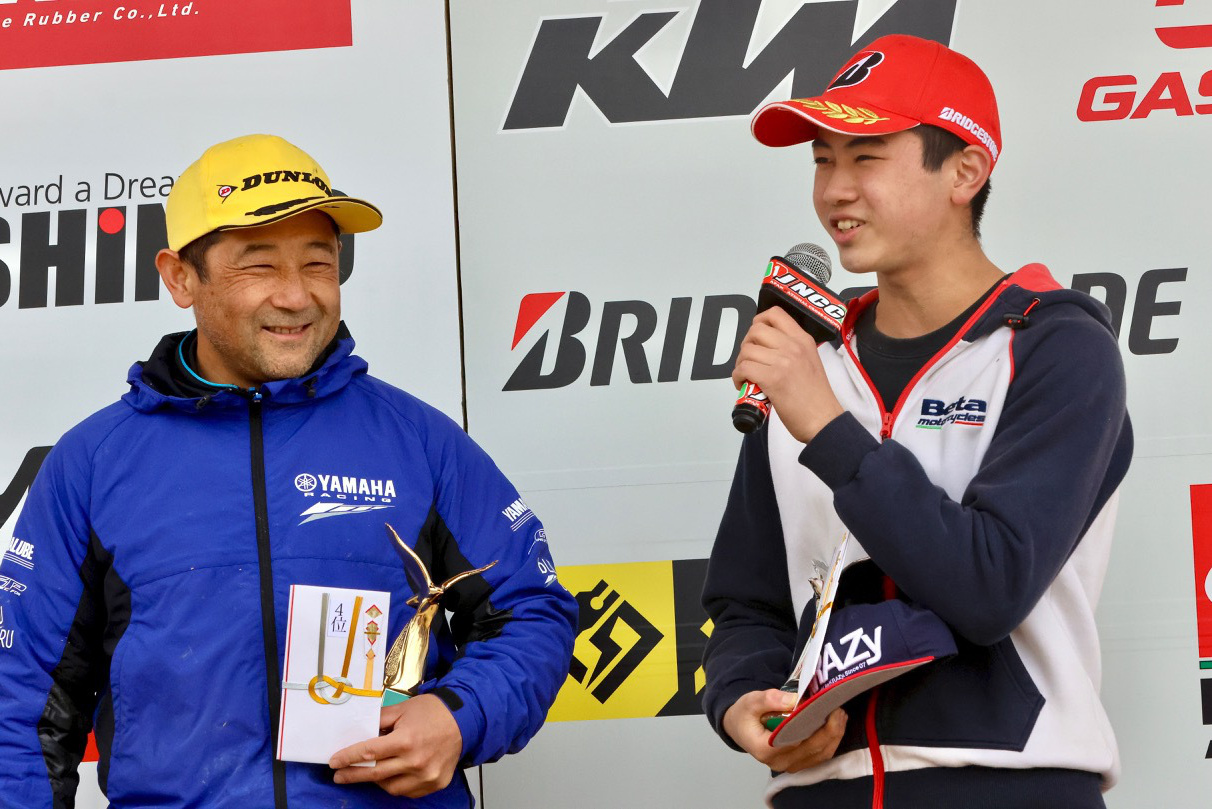 - COMP-AA2クラス はベテラン 鈴木健二 選手(bLU cRU Blue Riders with YAMALUBE)と、若手ルーキーの 渡辺敬太 選手(Beta FULL GAS Racing &フレアライン)による一騎打ち。「中学生に後ろから煽られ煽られ、おじさんにはきつかったけど、若いライダーが最後までついてきてくれたのは楽しかったです」と満面笑みの鈴木選手。渡辺選手も「目標の一桁でゴールできたこと、健二さんと走れてすごく楽しかったです!」と興奮さめやまない表彰式となった。
