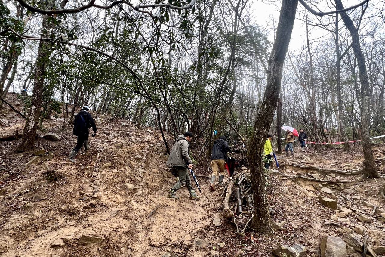 - カットされることとなった新規開拓セクションは今後のお楽しみということにしておき、さっそく前日は下見がてら歩いてみた。下見中のライダーの皆さんが真剣にラインを検討していたのは、やはりテージャス山南側の沢からの上りだった。3本以上のラインが確保されているが、すべて簡単ではない。なにしろ一直線に簡単に上り切れるラインが皆無。スタック者がいるなかで毎周的確に判断して、ときに瞬時に方向転換できないとスムーズにクリアできない。ショートカットされたとはいえ、この雨天の厳しい状況のなかでは十分に新セクションが機能していたと言えるだろう。
