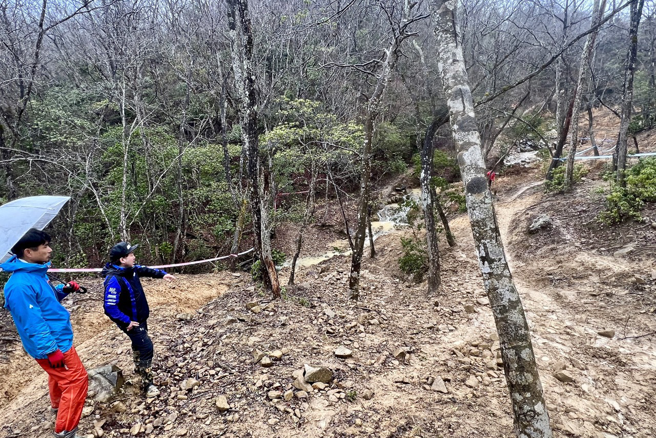 - さて 今回のコースは事前にSNSなどで発表されていたように、ウッズ区間の新規開拓がなされていた。コースディレクターの JNCC萩原一氏いわく、「今回は雨の影響で残念ながら2~3割はカットを余儀なくされましたが、狙いとしてはウッズやガレのある上りとキャンバーなどの区間を増やして多彩なテクニックを駆使できるようにしたことと、ラインの自由度を高めて大渋滞などを解消して楽しくレースができるようにすることでした」と説明してくれた。