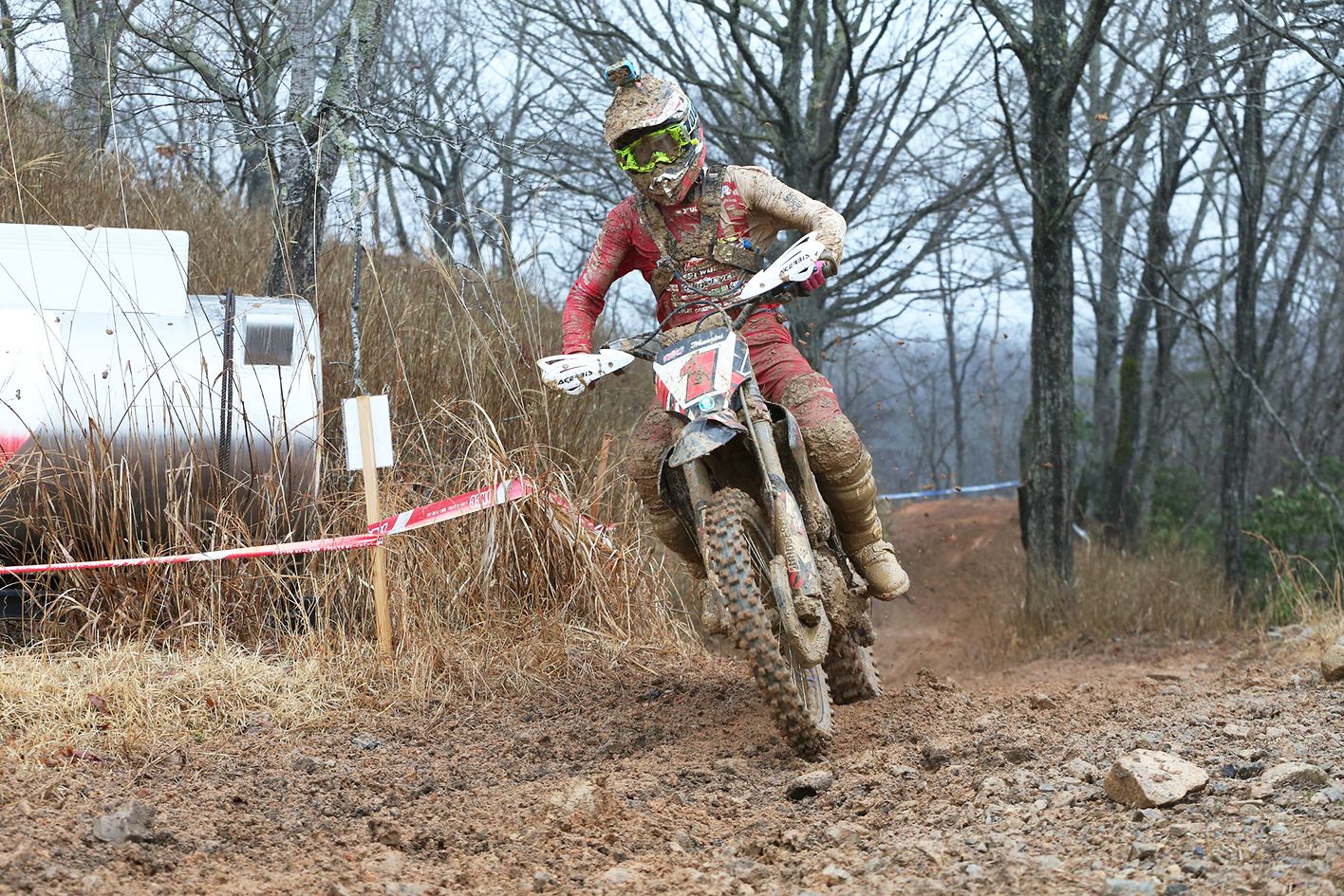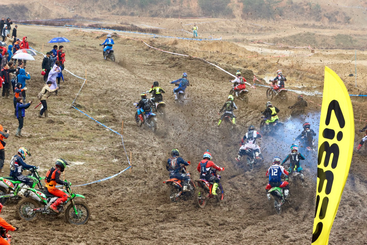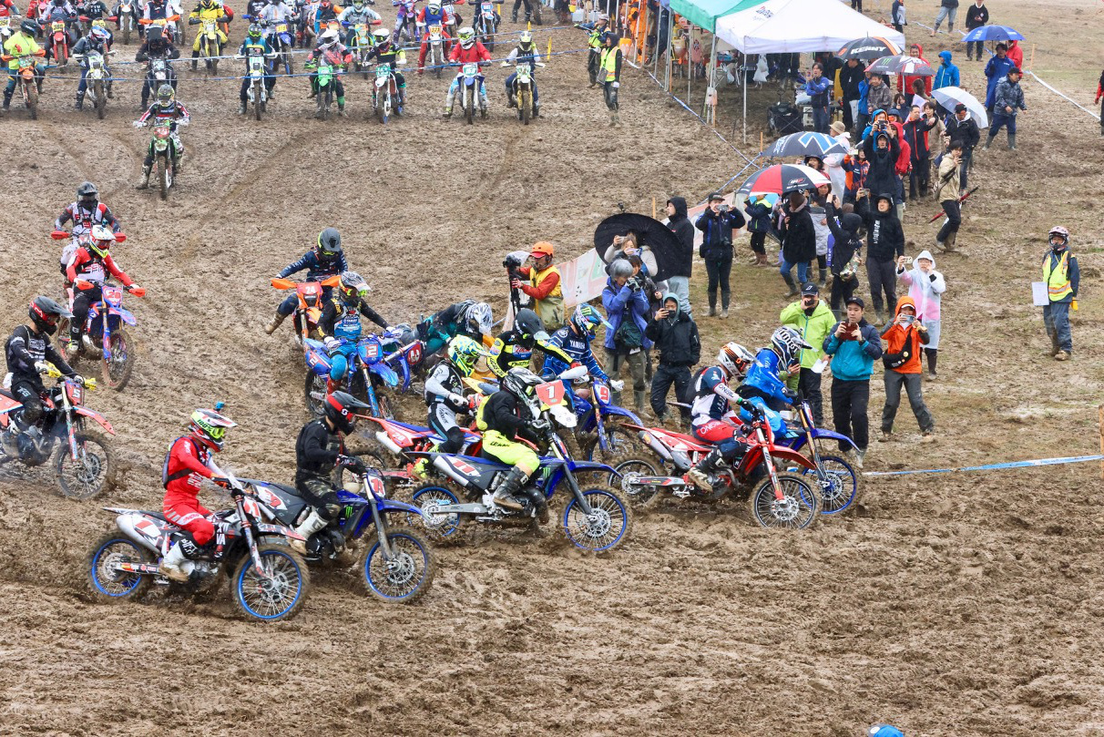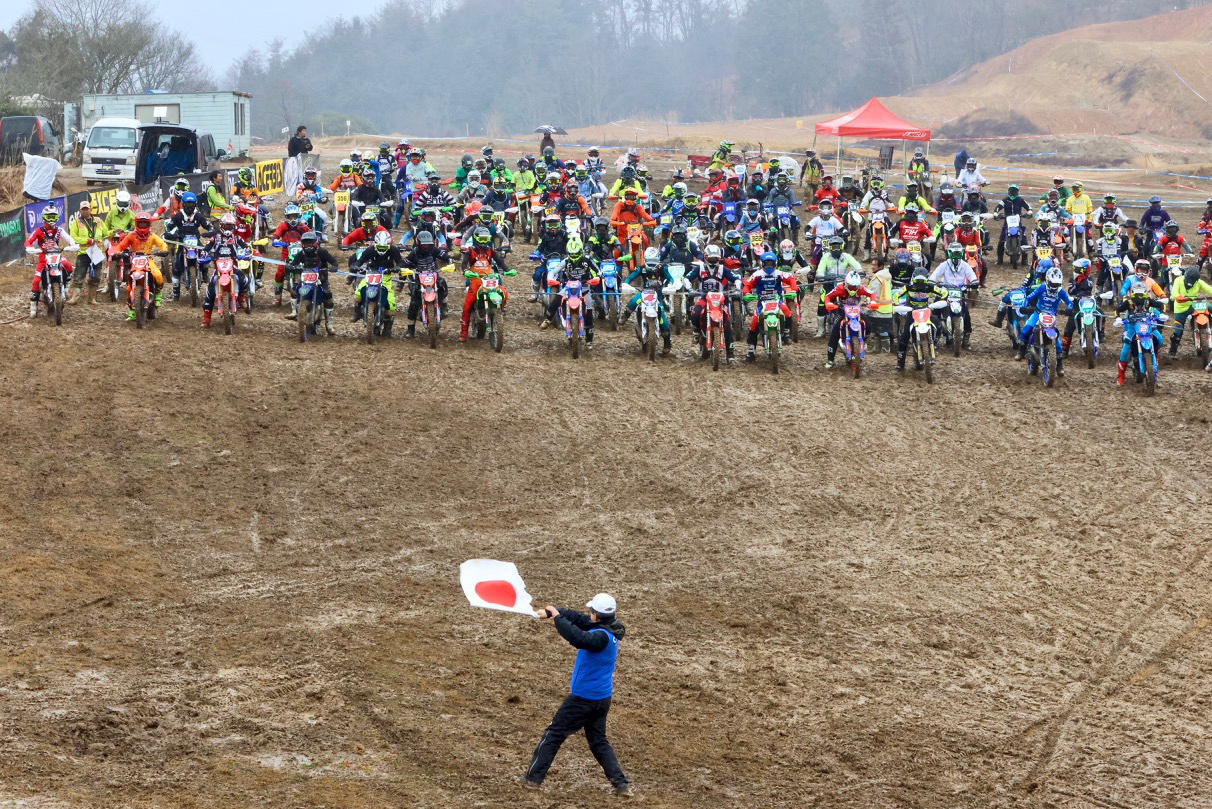 - 広島県安芸高田市のコース「テージャスランチ」は、モトクロスコースやゲレンデコースともまた一味異なる独特なシチュエーションを誇る広大な会場だ。アクセルワイドオープンの フラットエリアやウッズ、沢、ガレ、ヒルクライム など多彩なセクションがライダーを待ち構える。毎年 JNCCが開催されているおなじみのコースではあるが、晴れれば埃が舞い轍は固まる。雨が降れば赤土は相当滑りやすくなり、路面の下に隠れている岩がグリップ力を失わせる方向に働く。いずれにしても簡単ではなくタフなコースだ。それゆえに県外からの参加者が多いのも特徴で10時間以上の時間をかけて関東などから遠征するライダーも多いのは、それだけの魅力を秘めていると言えるからだ。今回のエントリー数は 323台。例年よりも寒い気候で終日雨が降ったものの、当初の降雨予想よりも少ない雨量ですんだのはラッキーだったかもしれない。しかし COMP-GP終盤 止んだ雨による土の重量増は、優勝を争うトップライダーたちをも苦しめることになったのだ…。