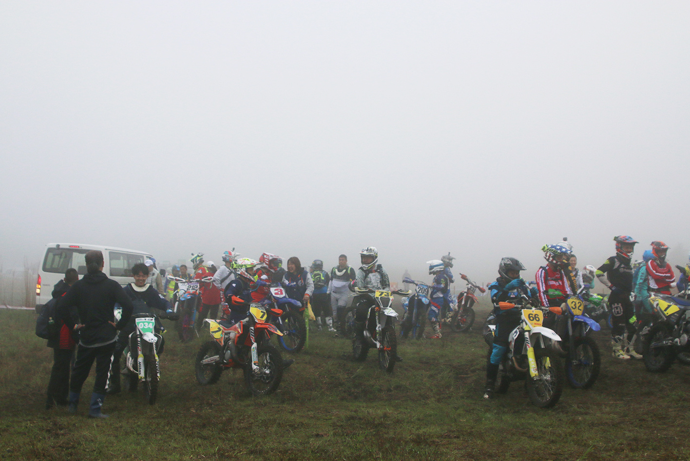 - レース当日の阿蘇外輪山は、早朝から濃い霧に覆われ、視界が20mという恐ろしいほどの状況。そのような状況の中始まるFUN-GPのレースは天候不良のため時間短縮が決定。100分の競技時間の所、65分+ラストラップなしに変更された。