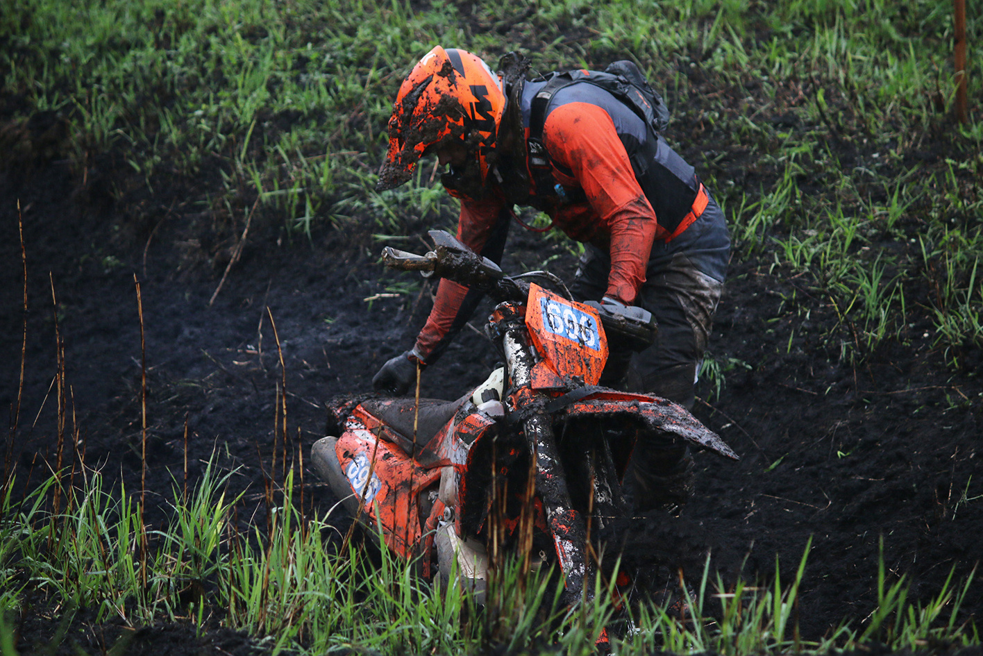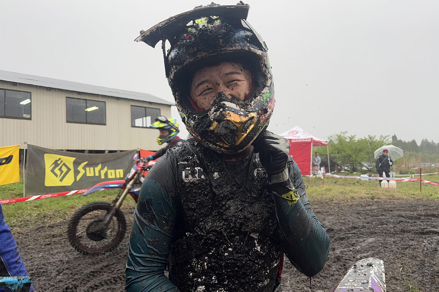 - 当日はあいにくの悪天候に見舞われ、まさに運命の一日となった。正午前から一転して雨に見舞われ昼休みの時間にはさらに雨脚が強まっていき、午前中に行われたFUN-GPとはまったく違うコースコンディションとなっていく。COMP開始前にはすでにコースコンディションが最悪の状態となっていたし、土砂降りの雨による路面の急変が影を落としたのだ。(まるで 2014年7月の悪夢が蘇ったかに見えた)レースが進むにつれさらに雨は強くなり、轍が深くなりすぎて至る所で前に進めなくなるライダーが出てくるという惨状となってしまい、序盤から次々とスタックに見舞われるライダーが出てしまう。