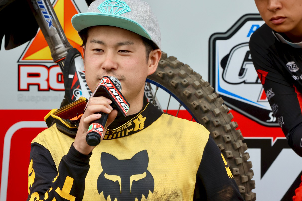 - 凄まじいホールショットを炸裂したのは 馬場選手。腕上がりで後退するも最後まで諦めない走りで2位を獲得。「全日本モトクロスチームの若い選手も頑張っているので、自分も早く勝ちたいです」とコメント。