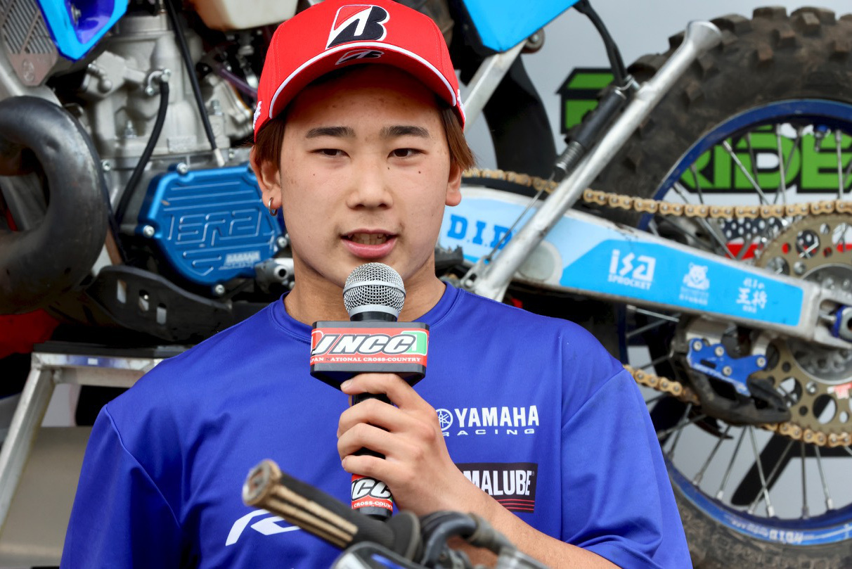 - COMP-AA2のバトルも熱かった。レースを制したのは小林選手、その46秒差でゴールした鈴木選手との僅差の争いは白熱した。ウッズでの二人の激走をしばらく注目していたが、レースの状況に応じてラインを変えていく彼らの走りはさすがベテランらしく、レースの組み立ても含めたバトルは長丁場のクロスカントリーならではの醍醐味だと感じた。このバトルを制した小林選手は「スタートは良かったんですがホコリで視界がなくなった際に抜かれちゃいました。前のグループには絡めませんでした」とコメント。成田氏のインタビューに「いままでも苦しいとかキツイことはせず、楽しく乗るスタンスでここまでやってきています。これからもそうしていきます」と返答。小林選手に限らず、JNCCを走る選手にはレースやバイクを「楽しむ」気持ちが常にある。これが普遍的な人気の理由でもあり、参加する人たちのモチベーションにも繋がっているのだろう、そんなことを改めて感じたレースでもあった。