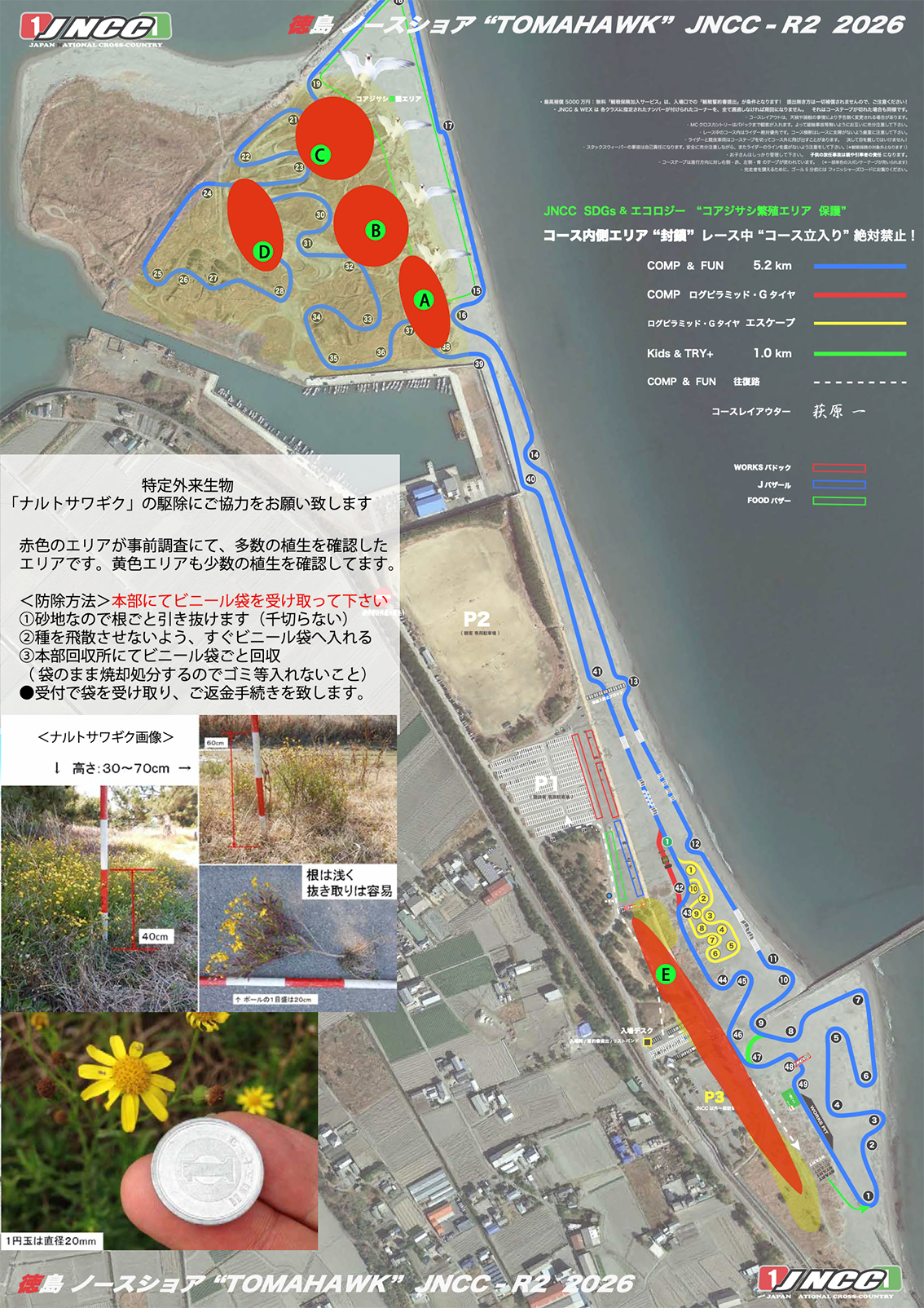 - エントラントと観客の皆さん そして大会関係者の皆様におかれましては、土曜の2時から1時間に渡り行われるこの「 JNCC ナルトサワギク撲滅駆除運動 」にご理解とご参加をして頂けますよう、何卒よろしくお願いいたします。