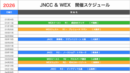 JNCC & WEX サイトにようこそ! 全日本クロスカントリー選手権 JNCC、東日本と西日本に別れてシリーズ展開する ワクワクドキドキのニューウェーブな WEX、この二つの クロスカントリーシリーズの 性格は上部メニューの「JNCC ポリシー」「WEX ポリシー」からご覧いただけますので、「モーターサイクル クロスカントリーとは」と 合わせてご覧ください。 初めての方は 下部「シリーズ内容 比較」から 各シリーズの特徴を一覧で ご覧ください。