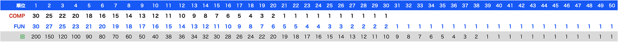 🔵 このオーバーオールランキング では COMP FUN 共に総合1位に 50ポイントが付与され、総出走数 350台を想定した上位80%のライダー( 250位 まで )に、上位ほどポイント差が顕著になる性格のポイント付与を行います。