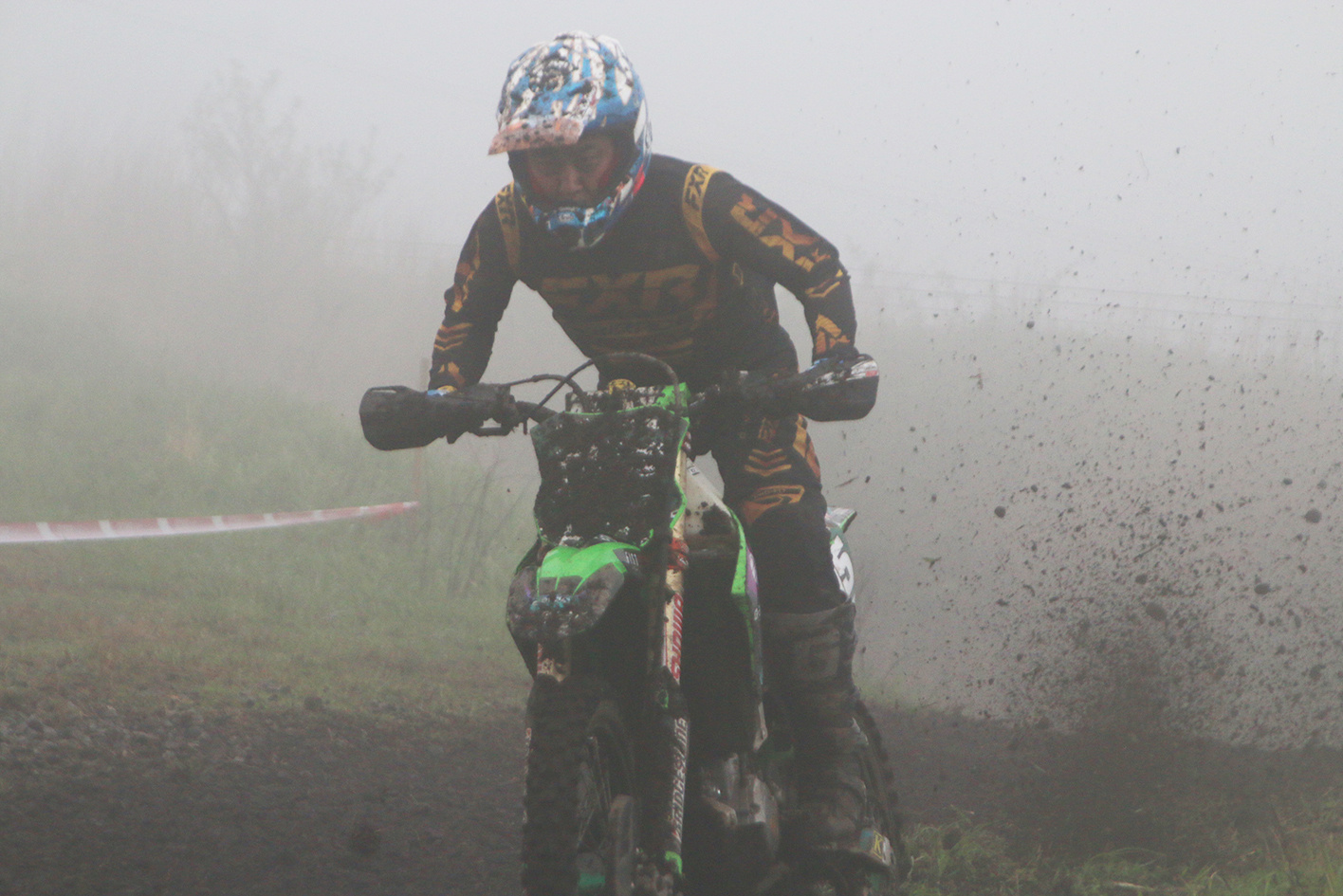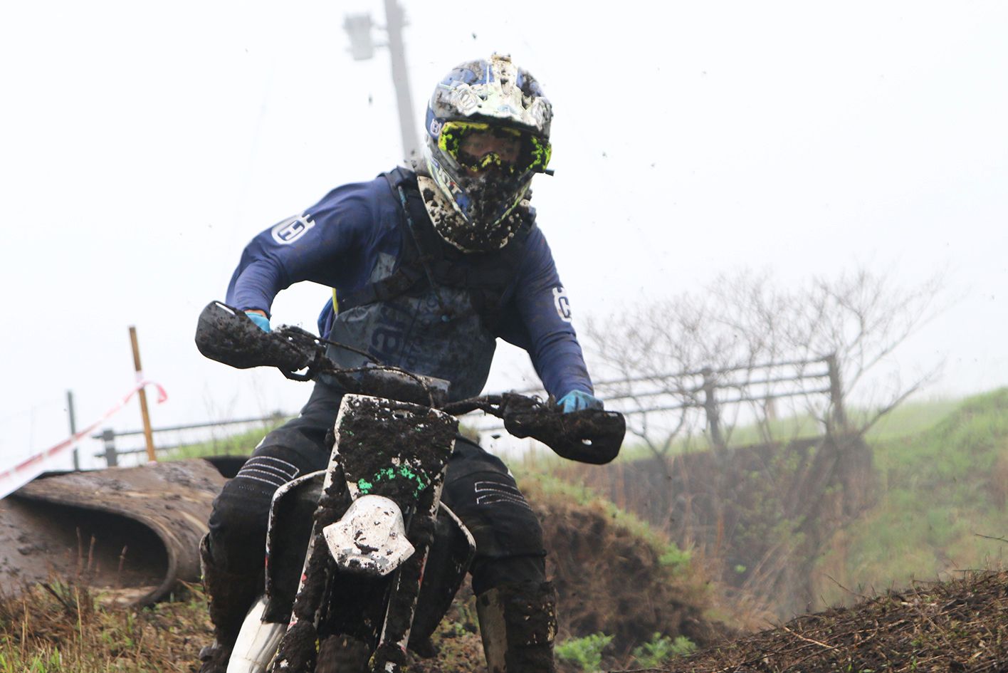 - 濃霧の中で好スタートを切ったのは 岩井良宏 選手(331 Racing Team)。レース序盤から厳しいコースコンディションの中を快走し、2位を走っていた 嶋岡虎汰朗 選手(ハスクバーナショップヒラタ自動車)に30秒近く差をつけてトップを走り続ける。だが状況が変わったのは最終ラップの後半、嶋岡選手の猛追を受け、激しいバトルの結果両者ともにコースアウトしてしまったのだ。そしてレースに復帰しようとコースに戻る際に転倒してしまった2人が接触し、嶋岡選手が左肩を脱臼するアクシデント。しかし 嶋岡選手は痛みに耐えながらそのままレースを続行し、見事に優勝を手にした。