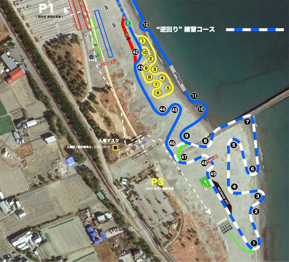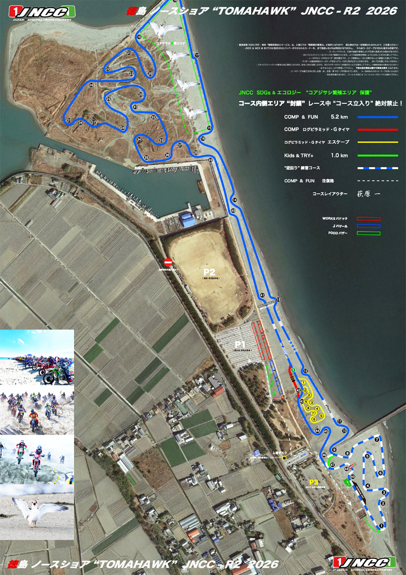 JNCC始まって以来になりますが、奥行きが限定的なビーチ特性と芙蓉の葉のように入り組んだレイアウトが可能なトマホーク部の個性により、観戦の魅力を失うことなく、まるでロードレースのように "RACEコース内側エリアを封鎖" して安全性を格段に向上させた、完全な "外周観戦" を提供いたします!
